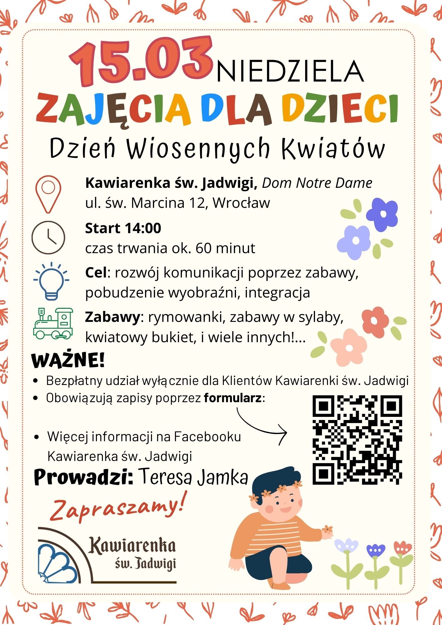 Przywołajmy wspólnie wiosnę na najbliższych zajęciach dla dzieci w Kawiarence św. Jadwigi! To idealny czas dla całych rodzin – godzina edukacyjnych gier i zabaw w miłej, rodzinnej atmosferze.