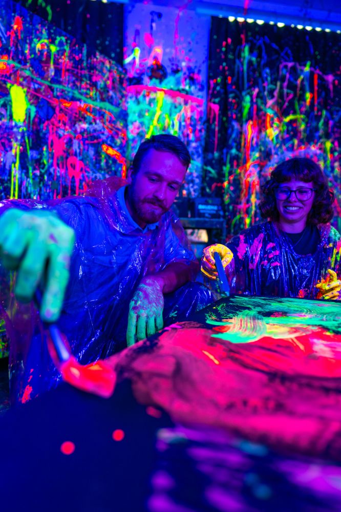Do Twojej dyspozycji oddajemy różnorodne sesje malowania w technice action painting. Prawdziwym hitem jest malowanie w ciemności – podczas wyjątkowych sesji FLUO odkryjesz magię tworzenia przy użyciu neonowych farb.